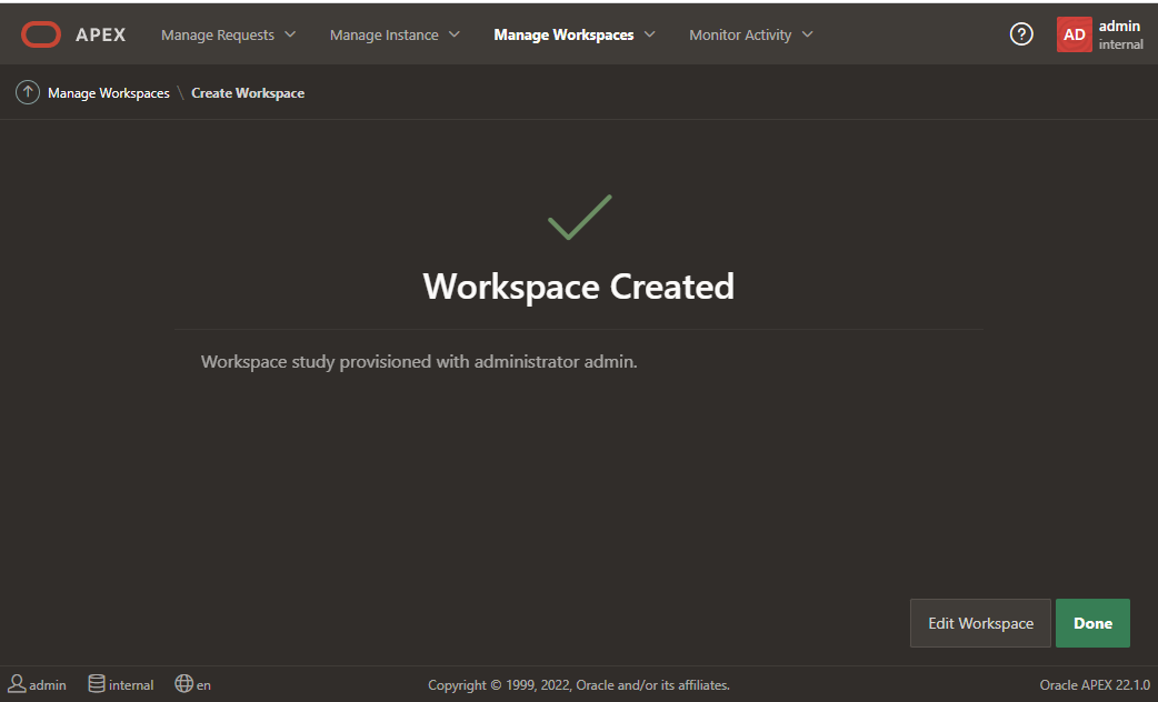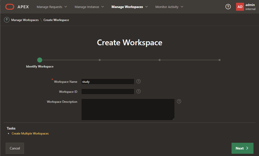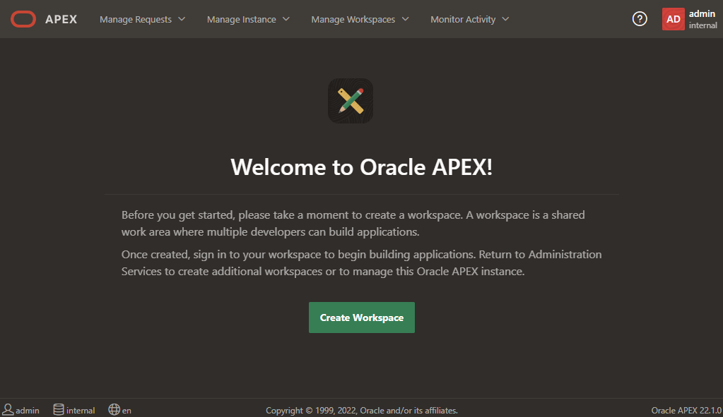 虽然 APEX 默认有一个名为 internal 的工作区,但它仅用于管理。如需创建应用,必须再创建一个新的工作区: