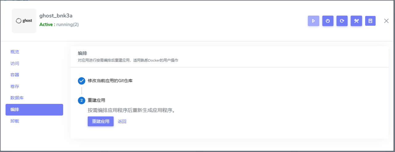 重新应用管理的 "编排" 标签页,点击 "重建应用" 按钮或右上角的重建图标