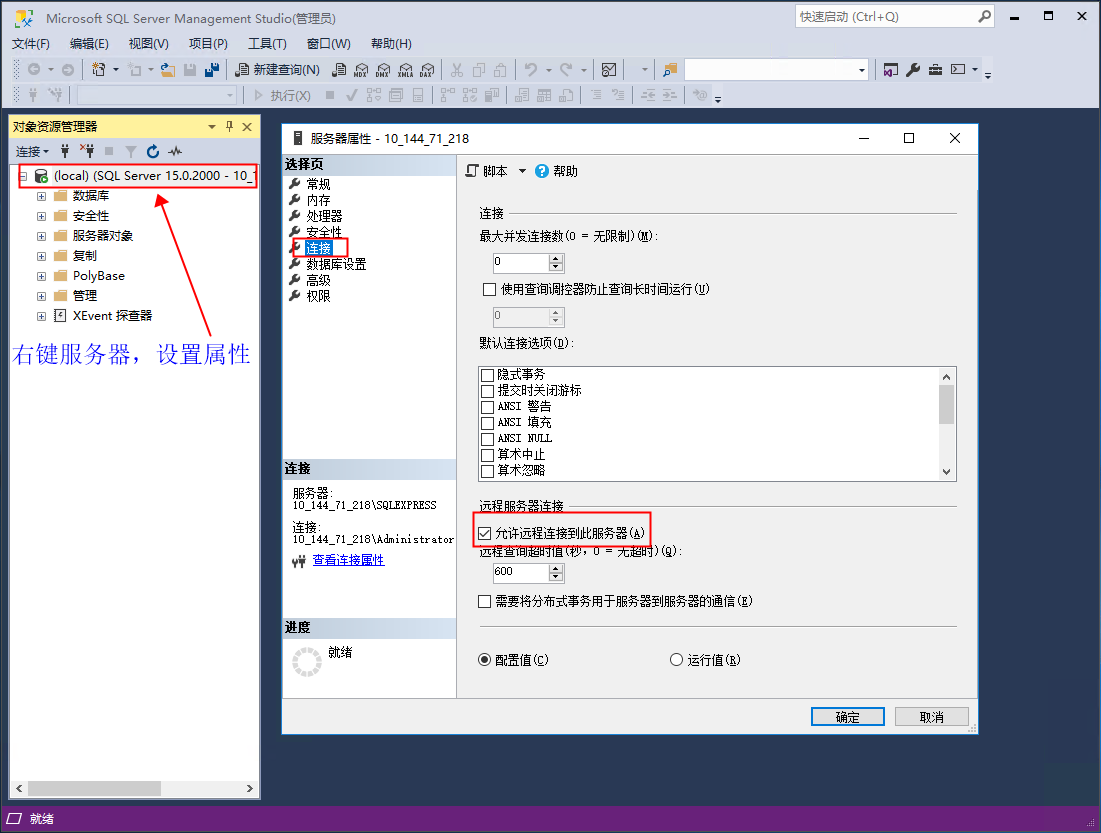 打开SQLServer企业管理器工具,在服务器连接属性中,勾选允许远程连接到本服务器