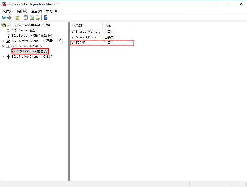 打开SQL Server 配置管理器工具,在网络配置中,启用TCP/IP协议